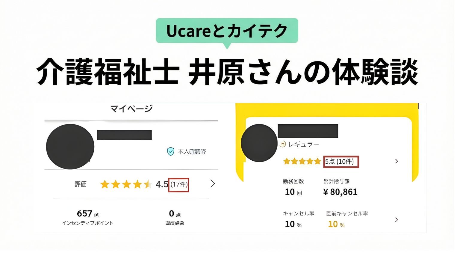 Ucareの利用を迷っている方に向けて、Ucareとカイテクで副業する私が2つの介護単発バイトを比較した記事です。