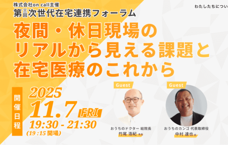 そのONCALLが主催するイベントが2025年11月7日(金)に以下のとおり開催されます。主に訪問看護師、介護士、ケアマネージャーなど多職種の医療関係者約100名が集まる予定です。